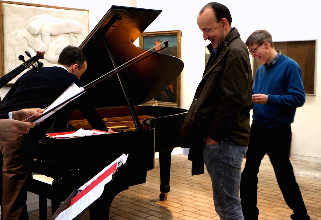 Richard Causton, centre with fellow composer Jeremy Thurlow. Roderick Chadwick prepares the piano for ‘Seven States of Rain’ and an Amati scroll waits for action! Kettle’s Yard 27 4 14 (Photo Malene Skaerved)